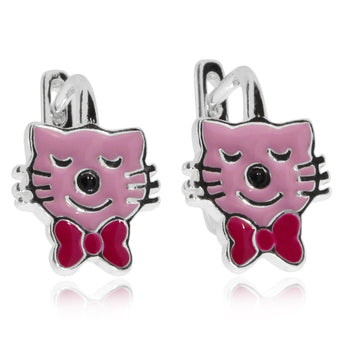 Dětské stříbrné náušnice s ručně malovaným dekorem mají pevné anglické zapínání. Náušničky jsou vyrobené ze stříbra o ryzosti 925/1000 a na jejich přední straně je usměvavá kočičí hlava s mašlí.