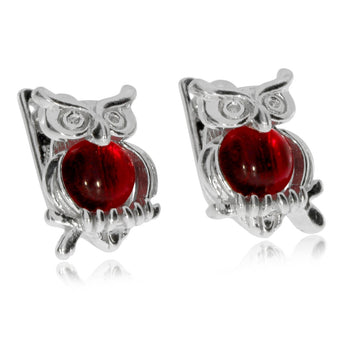 Dětské stříbrné náušnice mají praktický patetní uzávěr a rhodiovaný povrch. Malé sovičky jsou ozdobené červeným sklíčkem, které je hladce vyleštěné do tvaru půlkuličky.