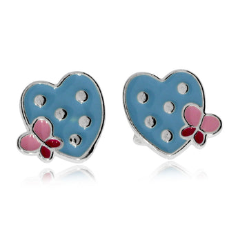 Dětské stříbrné náušnice - Modré srdíčko s motýlkem