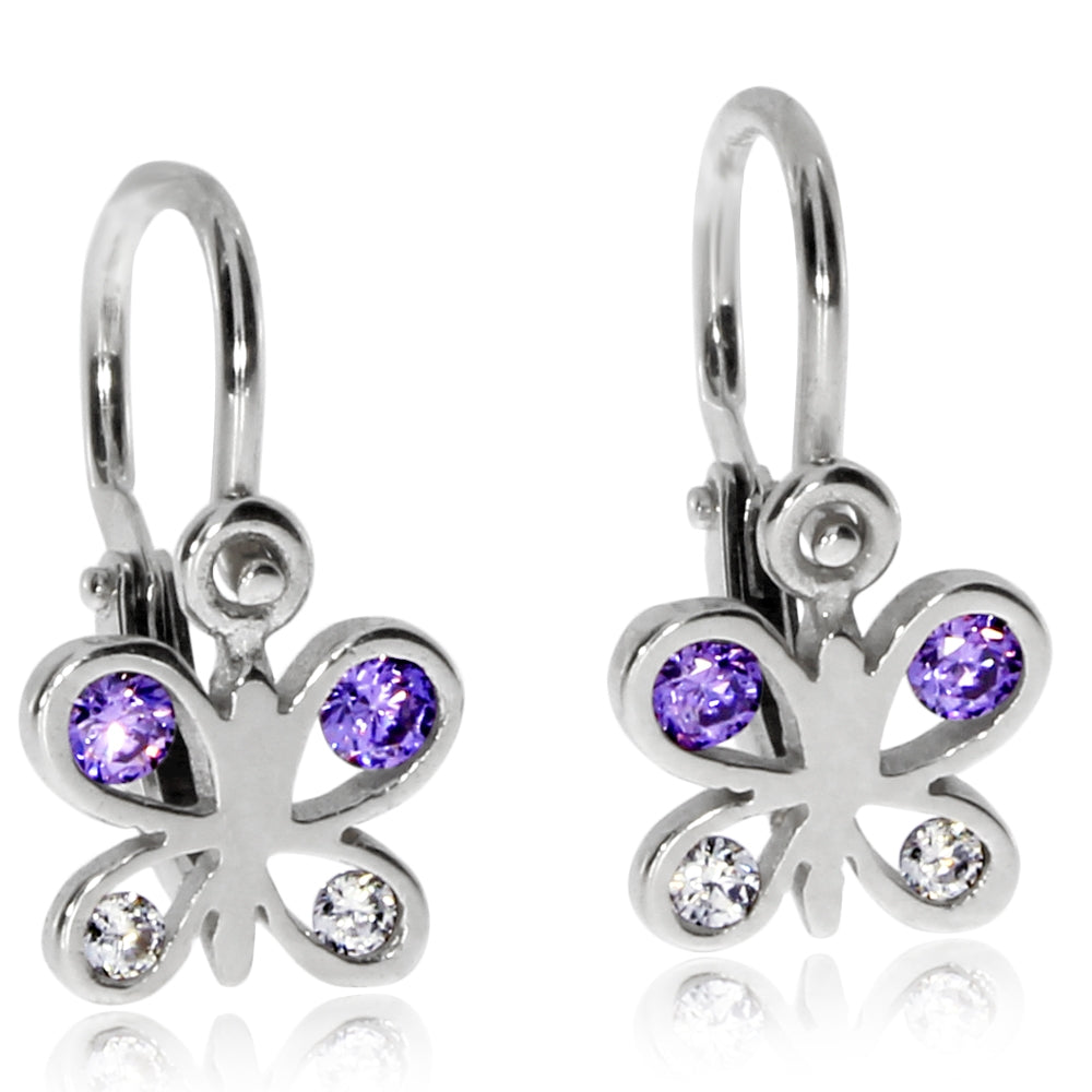 Zlaté dětské náušnice motýlci ve fialovo čiré kombinaci