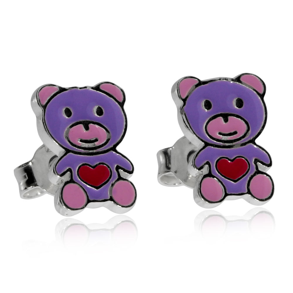 Stříbrné dětské náušnice ve fialovo - růžové kombinaci tvarem medvídci