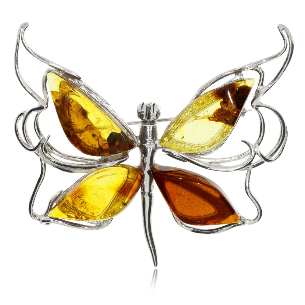 Půvabná stříbrná brož je stylizovanáí jako motýl s křídly ozdobenými jantarem. Různě barevný baltský jantar dodává broži excentrický náboj. Na rozdíl od naprosto přesné pravidelnosti barevných skvrn na motýlích křídlech je barevnost jantaru zcela nahodilá. Půvab brože je právě v nepravidelnosti barev a tvaru křídel. Jantarová brož tak spíše připomíná uměleckou kresbu než stříbrný šperk. Právě tato lehkost uměledkého ztvárnění oblíbeného motivu šperků - motýla - je velkou předností této větší brože.