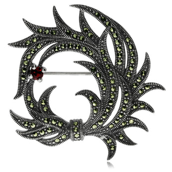 Brož patří k vůbec nejosobitějším šperkům. Tato je krásně zpracovaná a zaujme na první pohled nádherným kovovým třpytem a jemným designem. Celá brož je posetá drobnými markazity, keré doplňuje kulatě broušený červený granát (almandin). Kameny dobře vynikají ve starostříbrném povrchu.