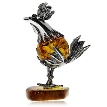 Do detailů skvěle zpracovaná figurka znázorňující kohouta je vyrobená z přírodního leštěného jantaru, vzácného organického materiálu, který je zde kombinován se stříbrem ve starostříbrné úpravě.
