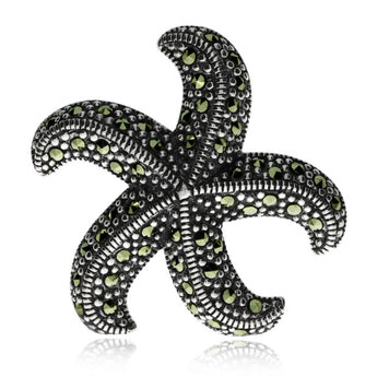Elegantní brož je vyrobená ve starostříbrné povrchové úpravě a je velmi hustě poseta drobnými broušenými markazity, které připomínají povrch skutečné mořské hvězdice. Navíc se jemně třptí a dodávají tak šperku jemný půvab. Brož je možné použít jako ozdobu na klopu saka nebo kabátu, ale také jako spínací špendlík na bolerko.