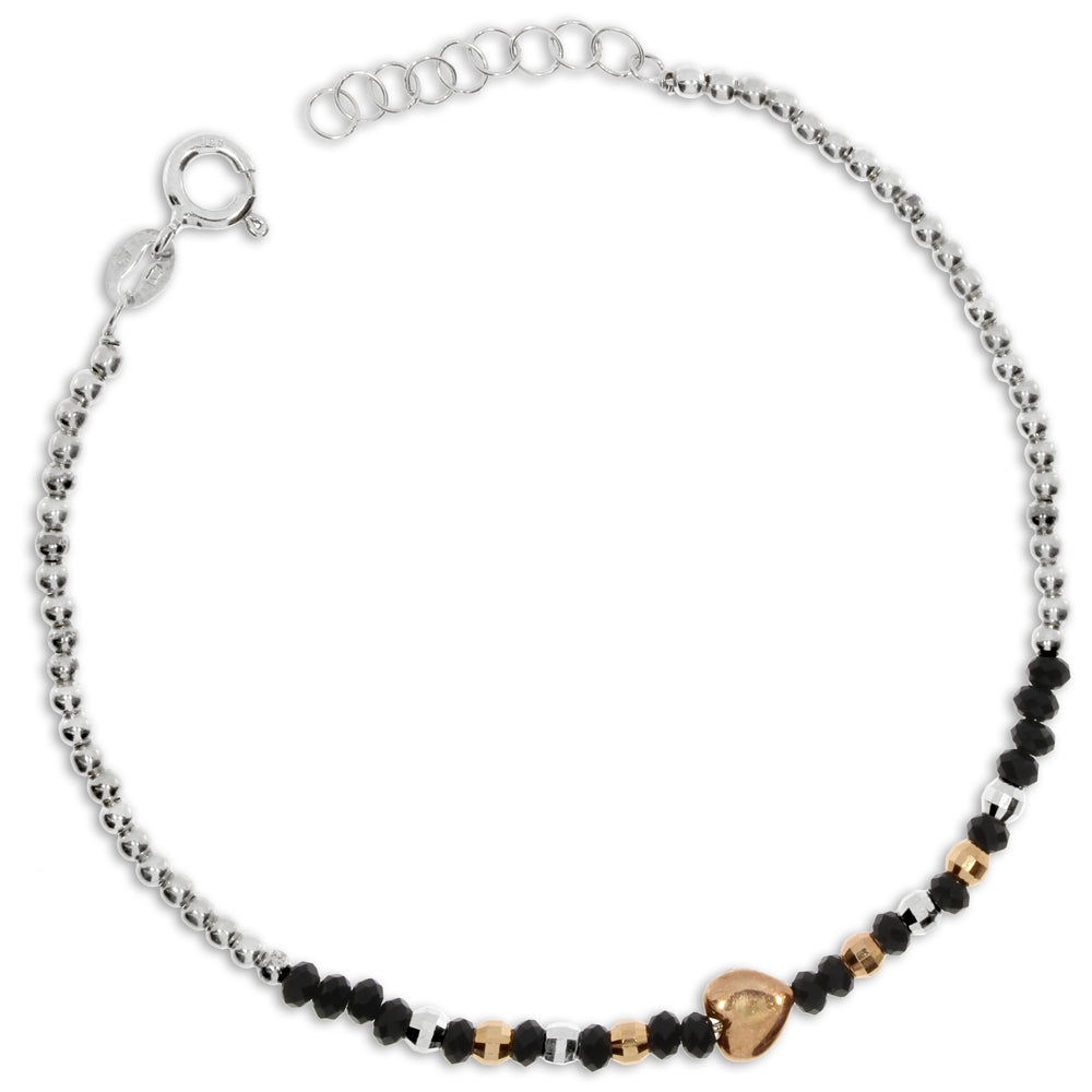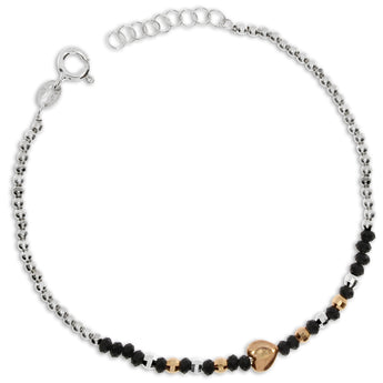 Stříbrný náramek se srdíčkem růžového povrchu a černými korálky
