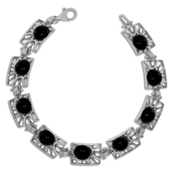 Dámský stříbrný náramek tvoří pohyblivě spojené obdélníkové články s motivem paprsků vycházejíchcích od černého kulatého onyxu. Náramek je dlouhýn 19 cm a v případně by mohl být řetízkem prodloužen, protože má zapínání na karabinu.