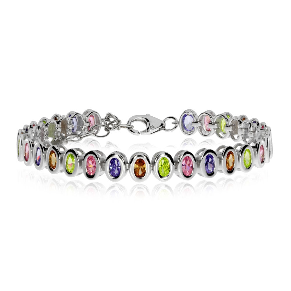 Dámský stříbrný náramek s oválnými kameny kubické zirkonie upoutá pozornost příjemným souladem rozmanitých barev kamenů. Náramek bude skvělým doplňkem jednobarevného oblečení, které svým půvabem zpestří. Základní délka náramku 17 cm může být prodloužena o připojený řetízek.