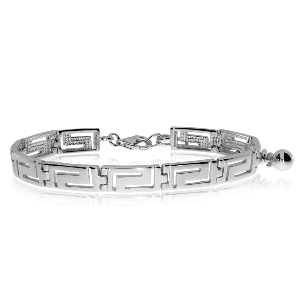 Elegantní styl šperků zdobených řeckým motivem meadru je prověřený staletími a je stále oblíbený. Na tomto stříbrném náramku je zajímavý protáhlý tvar jednotlivých článků, které jsou ozdobeny průřezy ve tvaru meandru. Jednotlivé články jsou pohyblivě spojené pevnými spoji. Základní délku náramku 17 cm je možné produžovacím řetízkem zvětšit až na 22 cm. Stříbrný náramek i prodlužovací řetízek jsou galvanizovány rhodiem s velice leským povrchem.