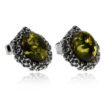 Stříbrné náušnice se zeleným jantarem ve zdobném oválu