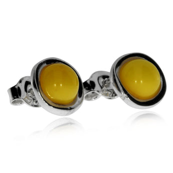 Jemné a velice jednoduché dámské náušnice, které skvěle ozdobí ženy a dívky s oblibou v nepříliš nápadných, decentních a přesto zajímavých špercích. Kruhové bodové náušnice nesou dokulata opracovaný jantar mléčné žluté barvy, který skvěle vyniká v zářivém stříbrném povrchu.