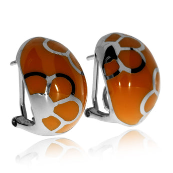 Originální retro náušnice v sobě spojují oblíbený módní styl a elegantní jednoduché provedení. Jsou vyrobené ze stříbra s rhodiovanou povrchovou úpravou. Ta zanechává kov krásně hladký, lesklý a také lépe odolnější. Zdobnou část náušnice tvoří oranžová a stálobarevná syntetická hmota se stříbrným květinovým motivem.