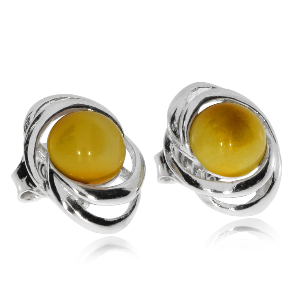 Jantarové náušnice v nepravidelně kroucené obrubě nesou ve svém středu světle žlutý neprůzračný jantar. Tato barevná varianta baltského jantaru patří momentálně k nejoblíbednějším. Náušnice jsou bodového tytu, obecně také nazývané \"pecky\" a jsou oblíbeným doplňkem jantarových šperků výraznějších designů.