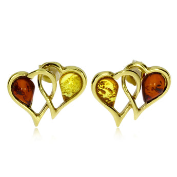 Stříbrné náušnice pozlacené - Jantarová srdíčka dvojí barvy