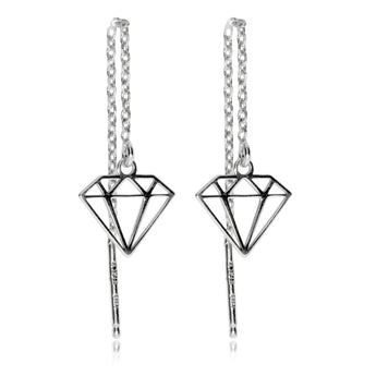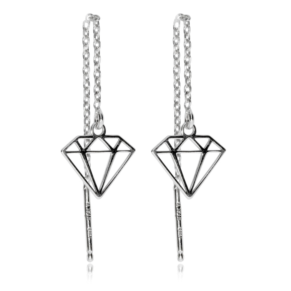 Dámské stříbrné náušnice specifického typu - provlékací řetízky do uší - jsou ozdobené symbolem briliantového brusu v závěsu. Náušničky mohou být zajímavou změnou a obohacením šperkovnice o lehkovážný design pro volné chvíle.