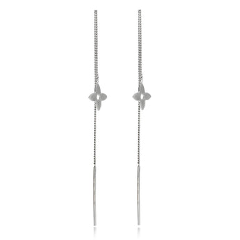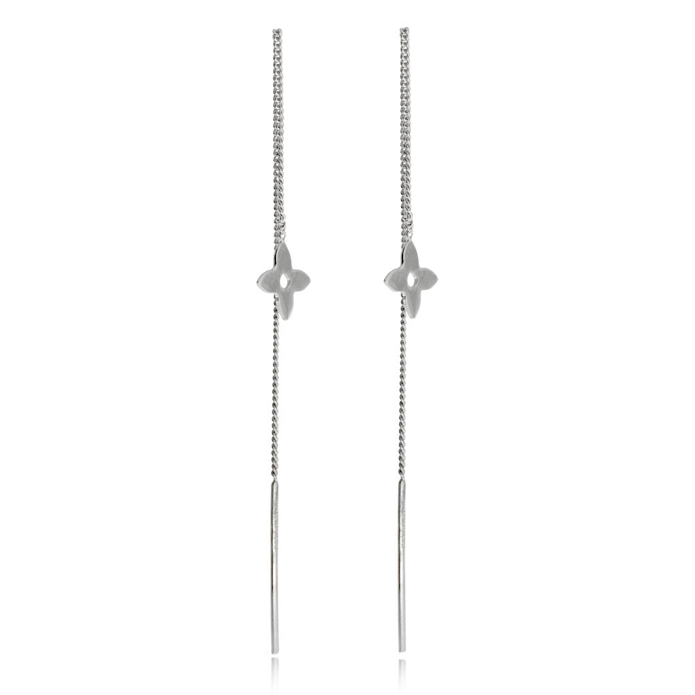 Dámské stříbrné náušnice s provlékacím řetízkem mají drobnou ozdobu ve tvaru zjednodušeného čtyřlistého kvítku na přední straně.