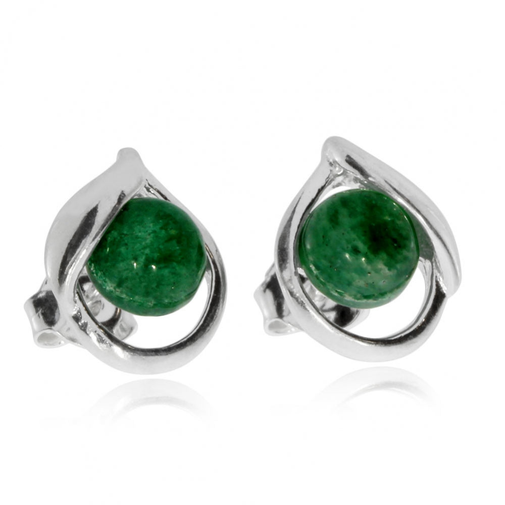 Dámské stříbrné náušnice na puzetu mají elegantní zašpičatělý tvar obruby, která je ozdobena drobným lístkem. Uprostřed náušnic se pyšní výzrazně zelený aventurin ve tvaru kulatého kabošonu s pěkně vyleštěným povrchem. Náušnice jsou vhodné pro každodenní společesnkou příležitost a mohou velmi elegantní doplnit barevnou kombinaci outfitu.