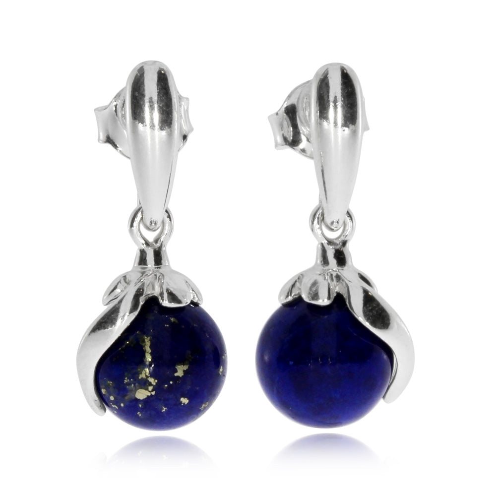 Dámské náušnice z leštěného stříbra o ryzosti 925/1000 mají zapínání na puzetu a jsou ozdobené kulatým přívěskem s modrým kamenem. Přrodní minerál lapis lazuli ve tvaru kulatého kabošonu je upevněn na krátkém pohyblivém závěsu, který je ozdoben stylizovaným lístkem. Půvabná kombinace lesklého stříbra a temně modré barvy lapisu lazuli je vhodná jak pro všední dny, tak svoji majitelku ozdobí i při slavnostnějších příležitostech.