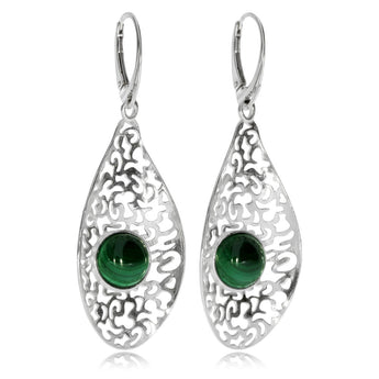 Velmi zdobné stříbrné náušnice zdobí kulatý kabošon malachitu v dekorativním přívěsku. Náušnice mají praktické zapínání na patent. Tyto stříbrné náušnice jsou vhodné především pro společenské události a je třeba počítat s tím, že jsou opravdu dlouhé - jejich délka dosahuje šesti centimetrů.