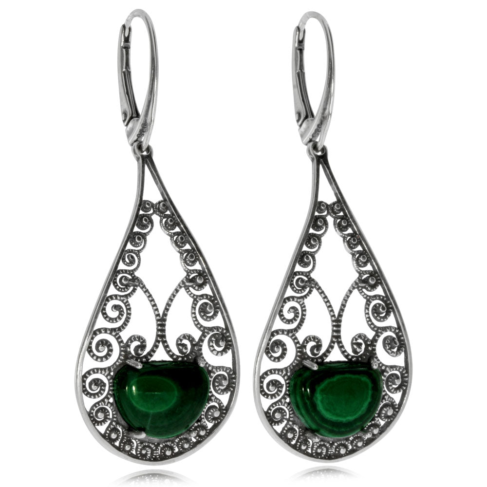 Stříbrné náušnice malachitem - Zdobné kapky