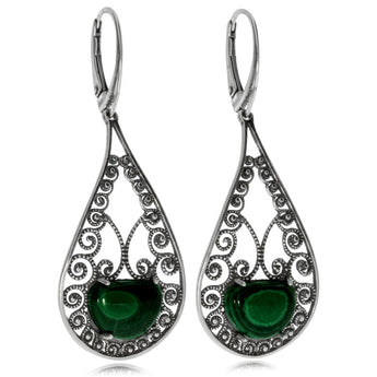 Delší visací náušnice jsou ozdobené přírodním malachitem. Vzdušné krajkoví přívěsků ve tvaru kapek se bude pěkně vyjímat zejména při slavnostních příležitostech. Náušnice jsou vyrobené z patinovaného stříbra o ryzosti 925/1000 a mají praktické patentní zapínání.