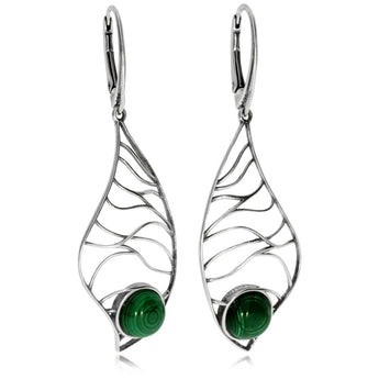 Delší visací náušnice z patinovaného stříbra jsou ozdobené drobným kulatým kabošonem přírodního malachitu. Přívěsky náušnic mají tvar nepravidelných kapek a jsou nápaditě ozdobené pavučinkovitými liniemi. Ačkoiliv jsou náušnice velmi dlouhé, jejich hmotnost je zanedbatelná a budou proto velmi pohodlné na nošení. K tomu přispěje ji praktické patentní zapínání.
