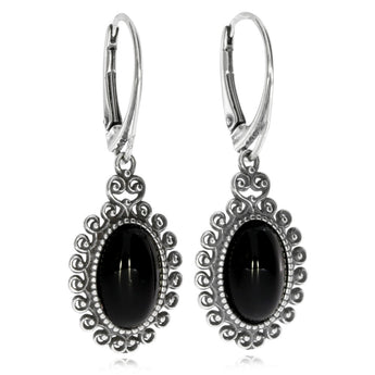 Dámské visací náušnice klasického tvaru jsou vyrobené z patinovaného stříbra o ryzosti 925/1000 a leštěného onyxu oválného tvaru. Větší kámen je lemován ozdobnou obrubou, která šperku dodává starodávný vzhled. Náušnice se uchycují pomocí klasického patentního uzávěru. Délka náušnic dosahuje téměř 4 cm. Náušnice se hodí jak pro denní formální schůzky, tak pro večerní společenské příležitosti.