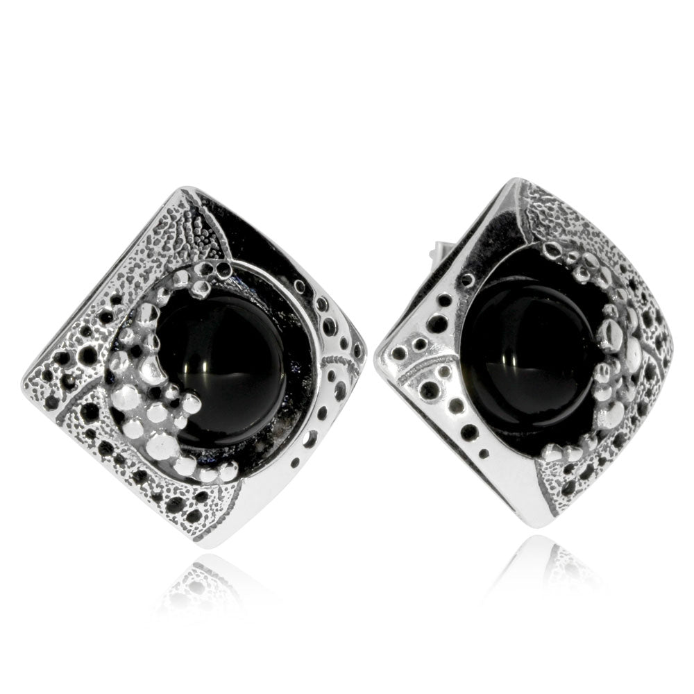 Dámské stříbrné náušnice s patinovaným povrchem jsou ozdobené nápaditým dekorem, který částečně překrývá kulatý kabošon přírodního onyxu. Zapínání náušnic je na puzety. Větší náušnice se budou velmi dobře hodit ke společenskému oblečení pro významnější pracovní schůzky nebo pro večerní příležitost.