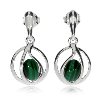 Dámské visací náušnice jsou vyrobené ze stříbra o ryzosti 925/1000, které je na povrchu rhodiované. Zavěšené kulaté přívěsky jsou zdobené nepravidelnými liniemi a oválným kabošonem přírodního malachitu. Zapínání náušnic je vyřešené na puzety. Náušnice budou vhodným šperkem pro denní dotvoření outfitu, s nímž budou barevně ladit.