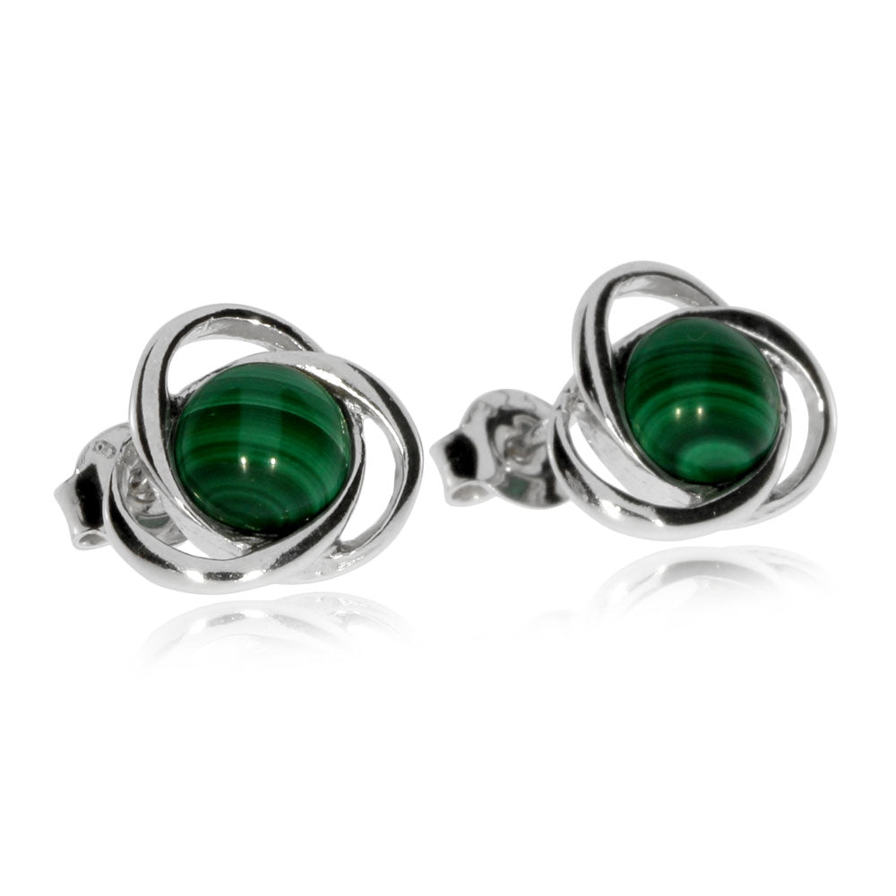 Stříbrné náušnice - Kulatý malachit v lůžku