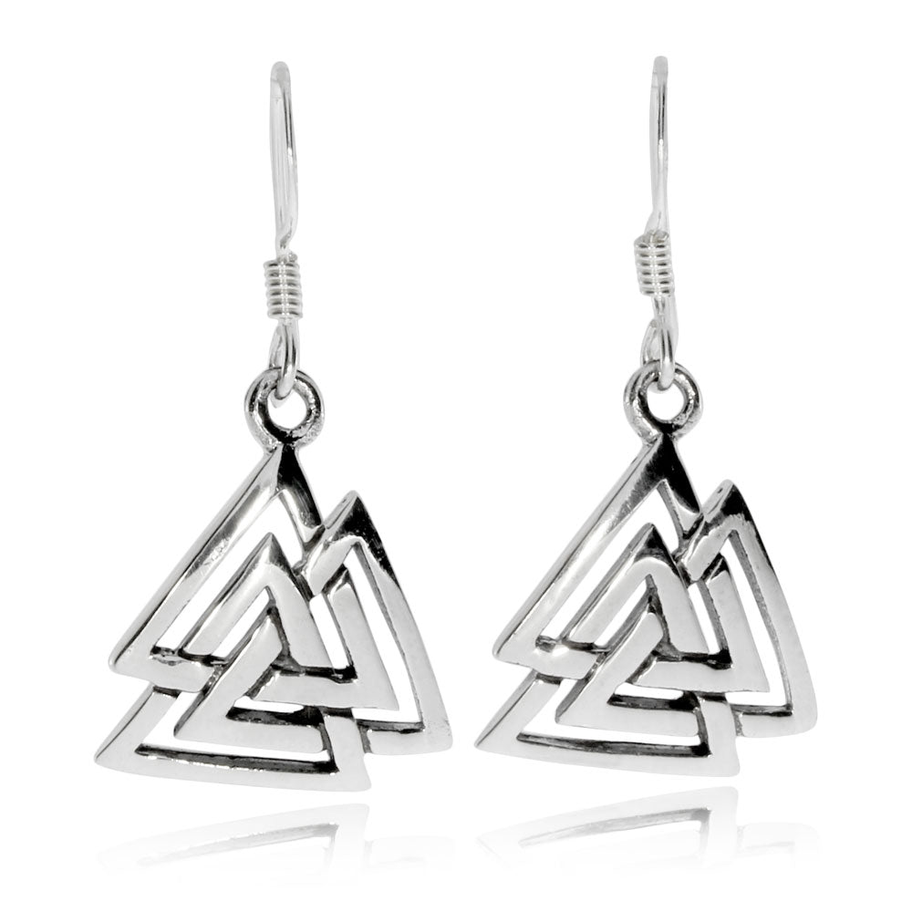 Dámské stříbrné náušnice nesou v přívěsku starobylý symbol vikingů - valknut. Tento symbol se skládá ze tříi vzájemně propletecných trojúhlelníků a je znám ze starých severských rytin a z runových kamenů. Symbol v sobě nesl mystický význam.