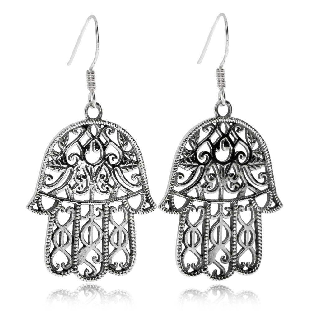 Stříbrné náušnice - Amulet ruka Fátimy (Hamsa