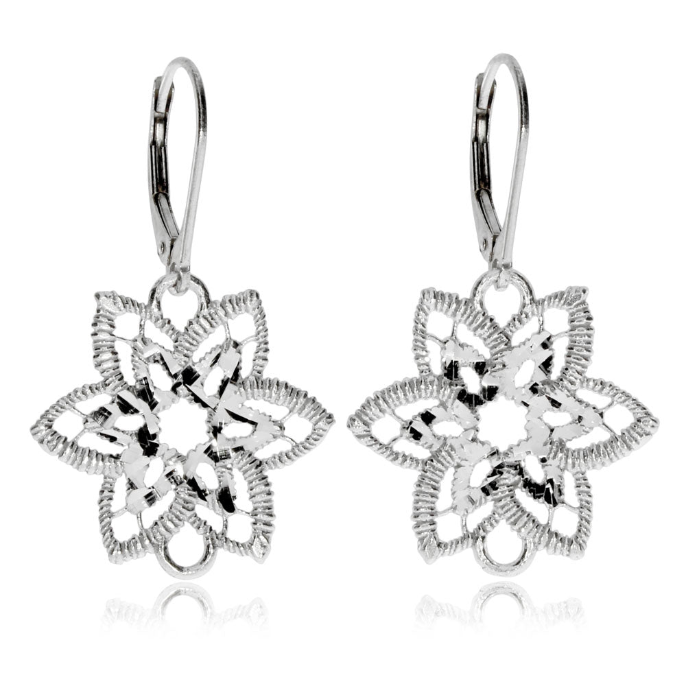 Půvabné stříbrné náušnice s rhodiovaným povrchem mají zapínání na patent a zdobí je přívěsky ve tvaru kytiček. Náušnice jsou velmi lehké, ačkoliv jejich délka je více než 3 cm.