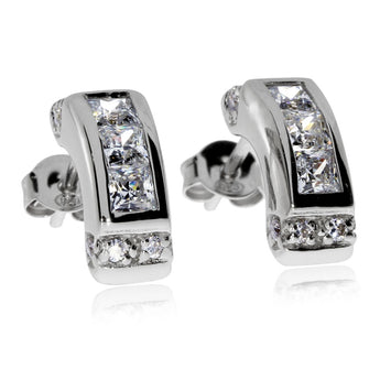 Dámské stříbrné náušnice se čtvercovými kameny kubické zirkonie v řádce a drobnými kulatými kamínky na okraji. Rhodiované stříbro s čirými kameny tvoří velmi efektní celek a náušnice svým tvarem a celkovým dojmem působí velmi elegantně.
