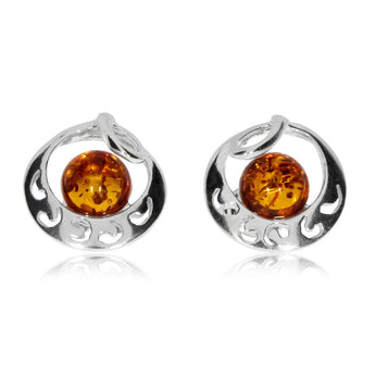 Náušnice ze stříbra - Kulatý jantar v ozdobném lůžku