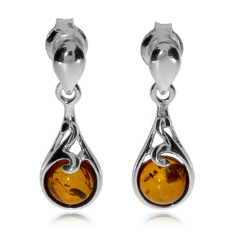Dámské jantarové náušnice jsou vyrobné ze stříbra o ryzosti 95/1000 s rhodiovaným povrchem. Jantar medové barvy a kulatého tvaru je zasazen do elegantního závěsu s jemným zdobením. Šperk je vhodný jak pro denní, tak večerní slavnostnější příležitost.