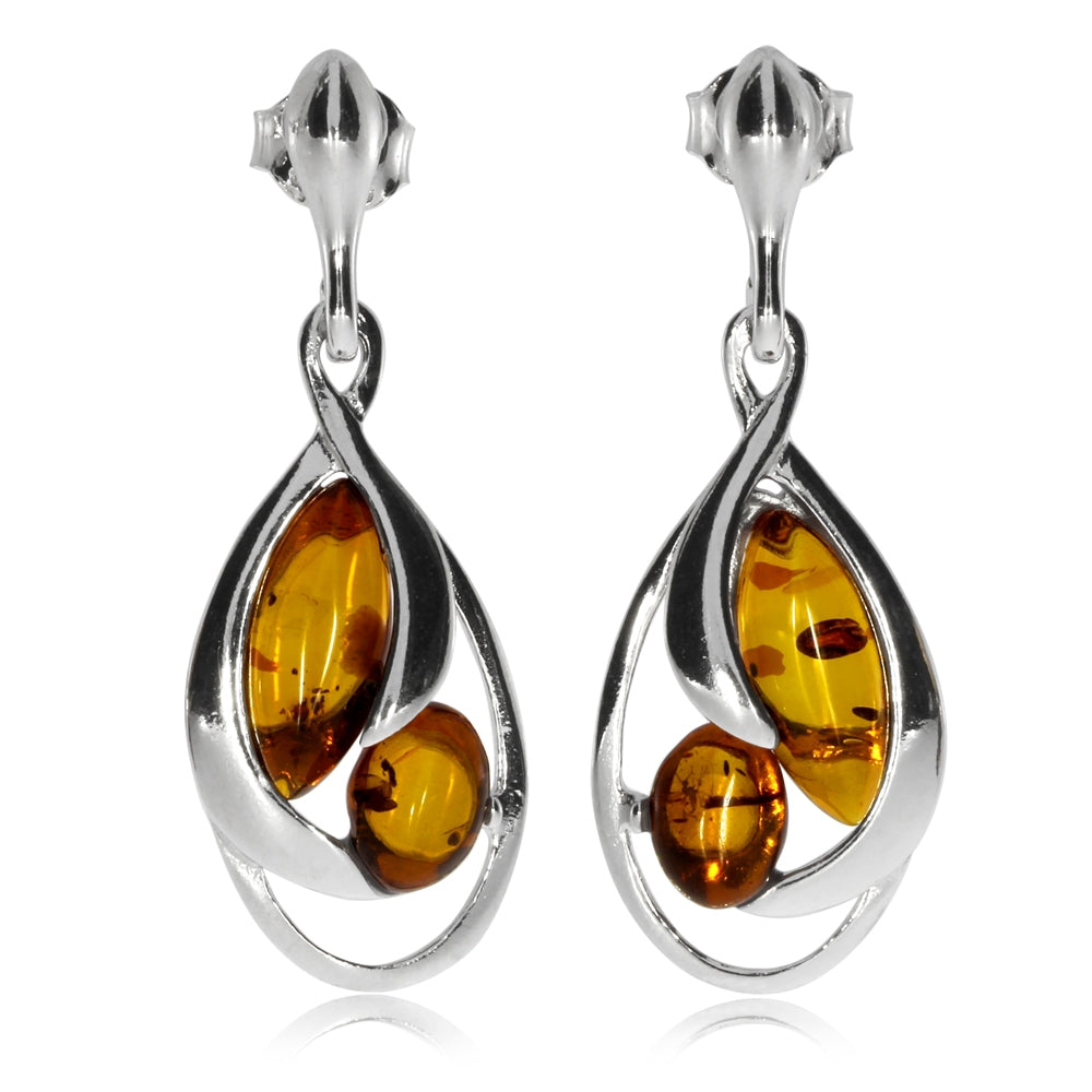 Elegantní stříbrné náuišnice nesou ve svých přívěscích po dvou jantarových kamenech různých tvarů. Tato zajímavá nepravidelnost jantarového šperku zaujme ženy s osobitým stylem. Povrch stříbrných náušnic je pokryt lesklým rhodiem a zachovají si proto skvělý lesk při jednoduché údržbě (občasné vyleštění suchým flanelovým hadříkem).