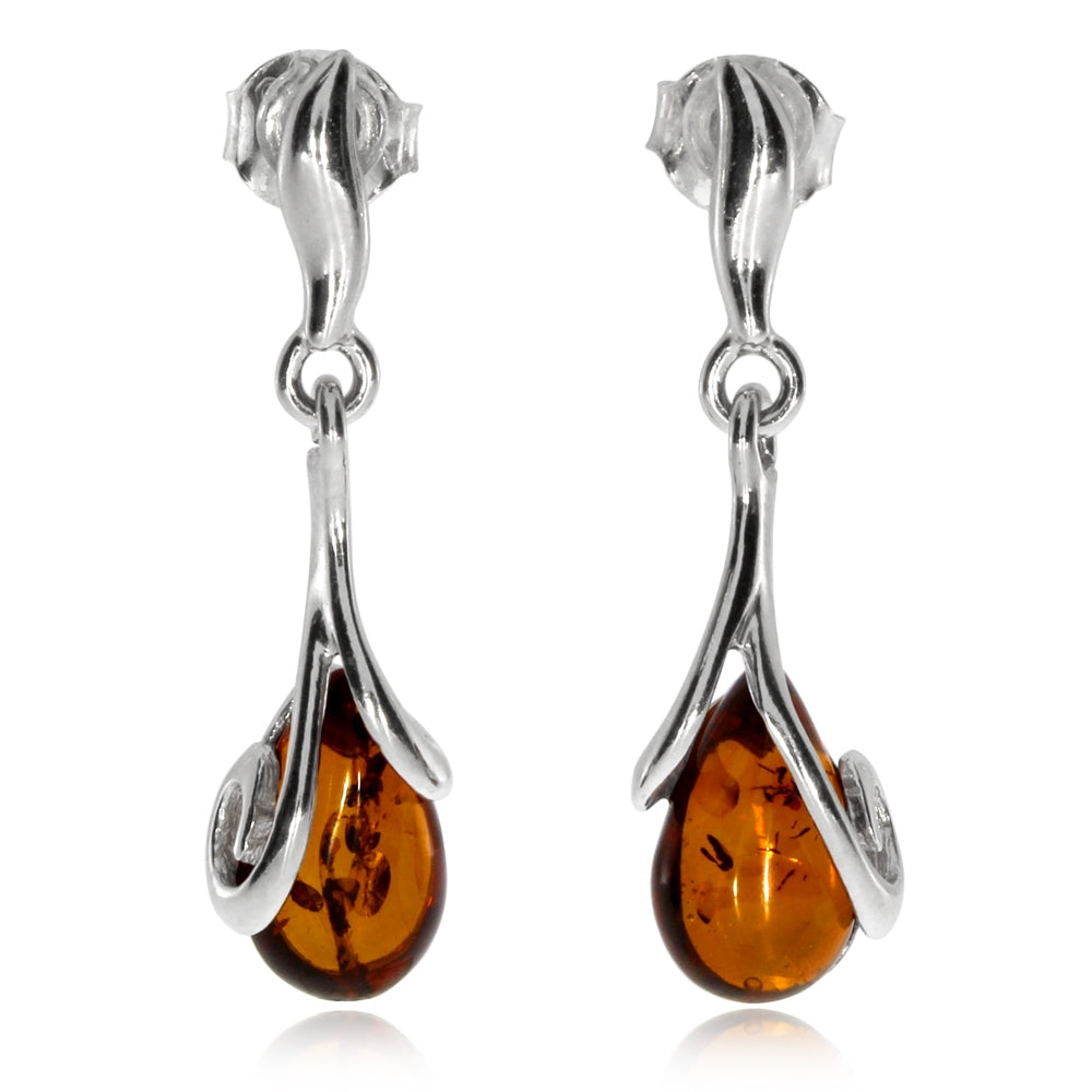 Stříbrné rhodiované náušnice na puzetu nesou na volně pohyblivém přívěsku kapky, které jsou ozdobeny po stranách jemnou spirálou. Baltský jantar má hnědou barvu, která je označovaná jako medová nebo jako barva koňaku. Náušnice jsou vhodné jak pro každodenní nošení, tak pro slavnostnější příležitost.