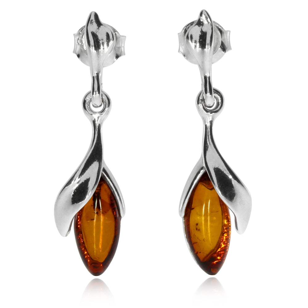 Stříbrné visací nášnice na puzetu mají volně pobyblivý přívěsek ozdobený jantarem ve tvaru markýzy a lístkem z rhodiovaného stříbra. Design náušnic připomíná jemný zavěšený květ. Vysoce lesklý povrch rhodiovaného stříbra vytváří velmi efektní kombinaci s hnědou barvou jantaru. Náušnice jsou vhodné pro každodenní nošení, ale dobře budou působit i při slavnostnější příležitosti.