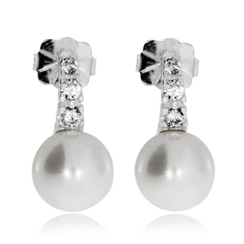 Dámské visací náušnice s velmi pěkným deisgnem jsou vyrobené ze stříbra o ryzosti 925/1000, které je pokryté lesklýim rhodiem. Náušničky zdobí syntetická perla na krátkém závěsu s čirými broušenými kamínky kubické zirkonie. Kombinace zářivých syntetických zirkonů a perlového efektu působí slavnostně. Svoji majitelku tak náušnice mohou zdobit i při večerních společenských příležitostech.