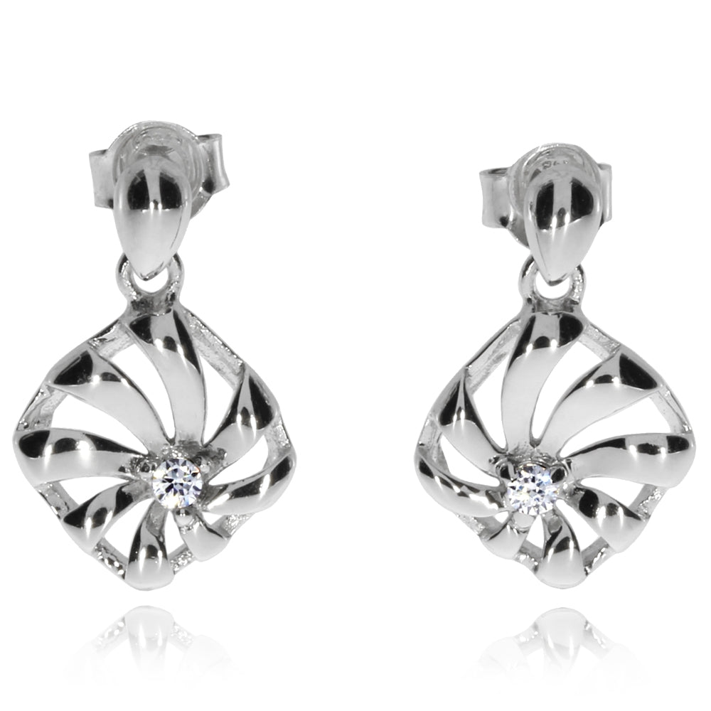 Půvabné náušnice jsou jako stvořené pro ženy a dívky s osobitým stylem a zálibou v netradičně zpracovaných špercích. Základem motivu je zajímavě strukturovaný kosočtverec nesoucí drobný syntetický zirkon (cubic zirconia). Ten mu propůjčuje jemný třpyt. Náušnice jsou vyrobené z rhodiovaného stříbra, které se krásně leskne a je dobře odolné. V naší nabídce najdete také přívěsek s obdobným motivem.