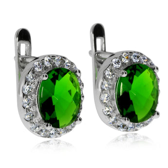 Půvabné dámské náušnice, které představují velice oblíbené zpracování plné elegance a luxusu. Náušnicím dominuje zelený oválný syntetický kámen, který zdobí čirá obvodová linie. Ta je posetá drobnými syntetickými zirkony (cubic zirconia) těšící se nápadnému třpytu. Náušnice jsou vyrobené z rhodiovaného stříbra.