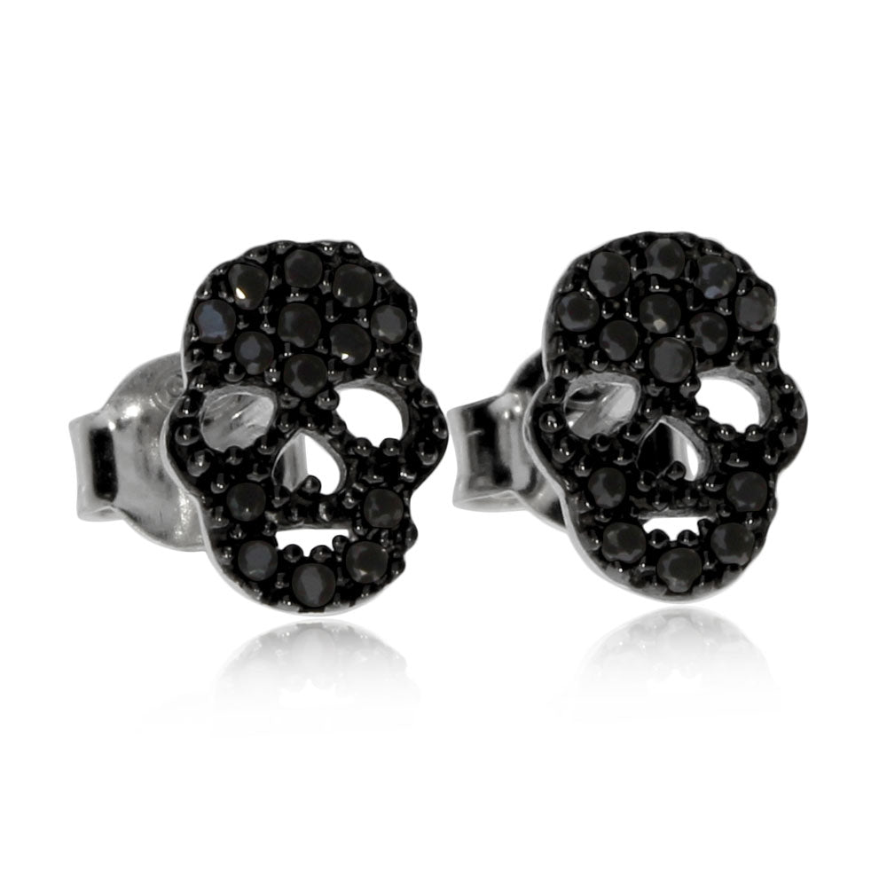 Stříbrné náušnice přesně podle moderních trendů se skvěle hodí pro každého, kdo jde rád s dobou. Na drobných bodových náušnicích jsou vyobrazené jednoduché lebky, které jsou poseté drobnými černými synetickými zirkony (cubic zirconia). Náušnice jsou vyrobené ze stříbra s rhodiovanou povrchovou úpravou, která se pěkně leskne a zanechává kov odolnější.