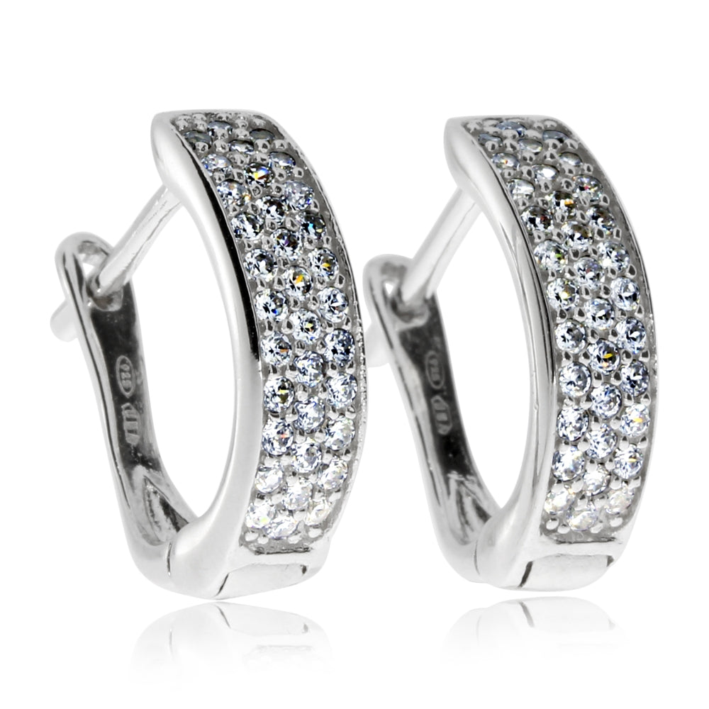 Nádherné stříbrné náušnice vhodné pro každou příležitost vyžadující eleganci, ale i pro každodenní nošení. Jsou vyrobené z dobře odolného a lesklého rhodiovaného stříbra a celá přední část je doslova posetá třpytivými syntetickými zirkony (cubic zirconia). Náušnice působí jemně a vybraně.