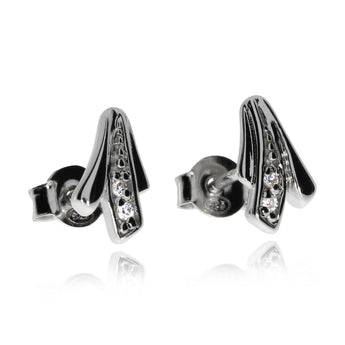Jednoduché a umírněné stříbrné bodové náušnice jsou zpracované s rhodiovanou povrchovou úpravou. Díky té je kov odolnější, hladší a také lesklejší. Jedna ze tří linií šperku nese jemné povrchové zdobení a několik zasazených drobných zirkonů (cubic zirconia), které se třpytí a oživují celý motiv.