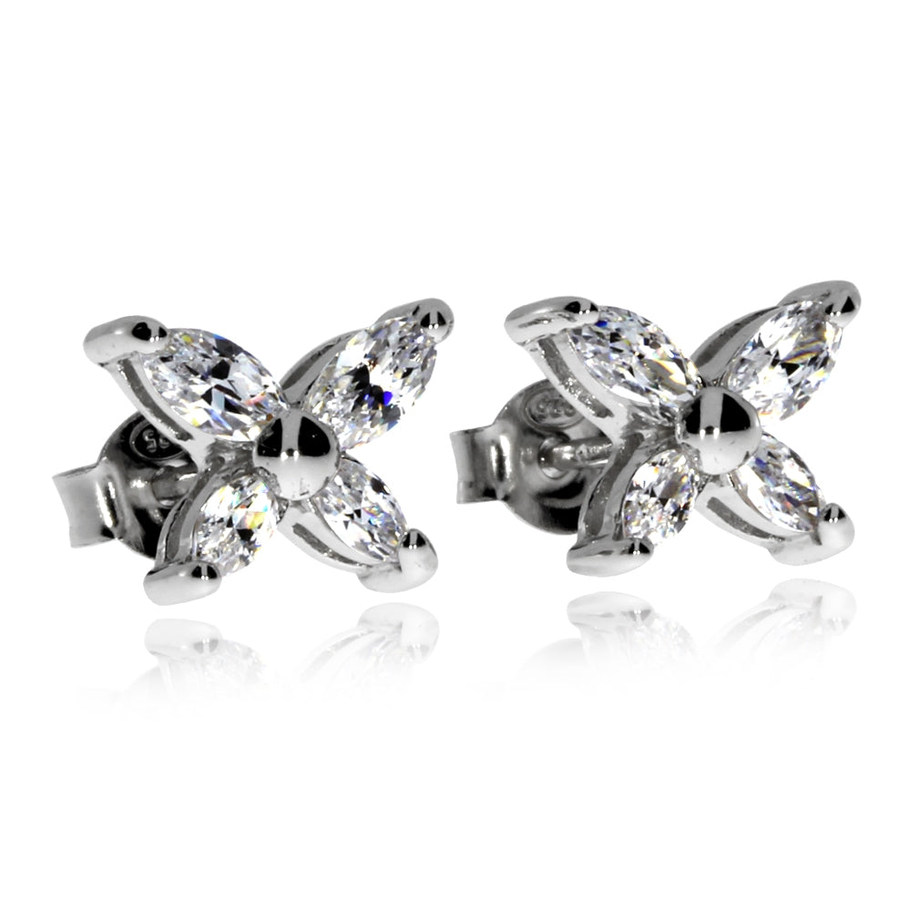Drobné náušnice plné zdobné jemnosti, elegantní jednoduchosti a dívčího půvabu jsou vyrobené z lesklého a dobře odolného rhodiovaného stříbra. Motiv ve tvaru motýlka je tvořený čtyřmi čirými a nádherně třpytivými syntetickými zirkony (cubic zirconia) vybroušenými do tvaru markýzy.