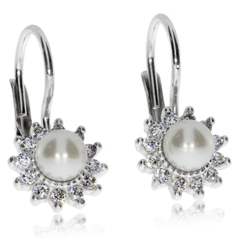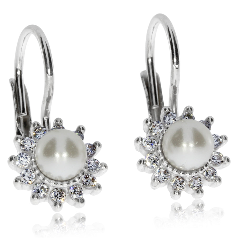 Střbrné náušnice zdobené syntetickou perlou a zirkony (cubic zirconia)\nStříbrné náušnice - Sluníčka zdobená syntetickou perl