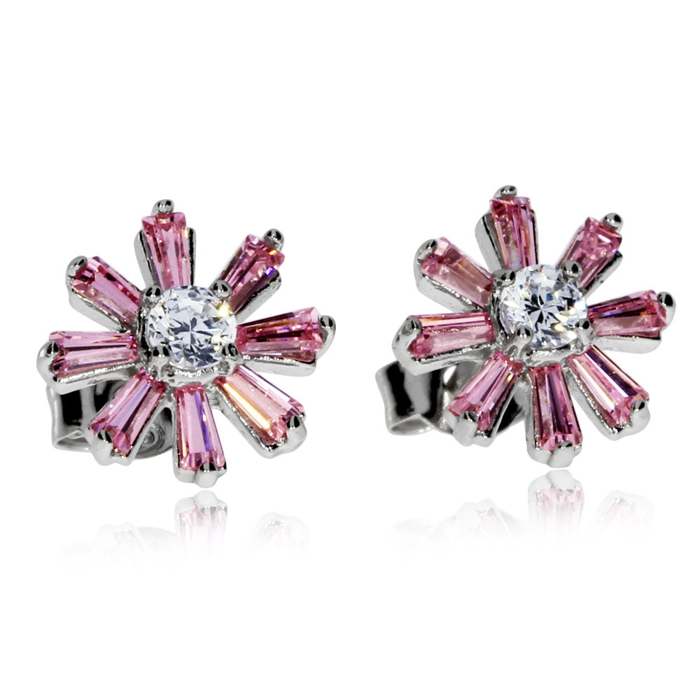 Dámské stříbrné náušnice ve tvaru kytiček s růžovými kamínky kubické zirkonie, které jsou vybroušené ve tvaru bagetky. Ve středu kytičky září čirý syntetický kámen kulatého briliantového brusu. Tyto náušnice mají jednoduché zapínání na puzety a jsou vhodné jako třpytivý doplněk na běžné nošení.