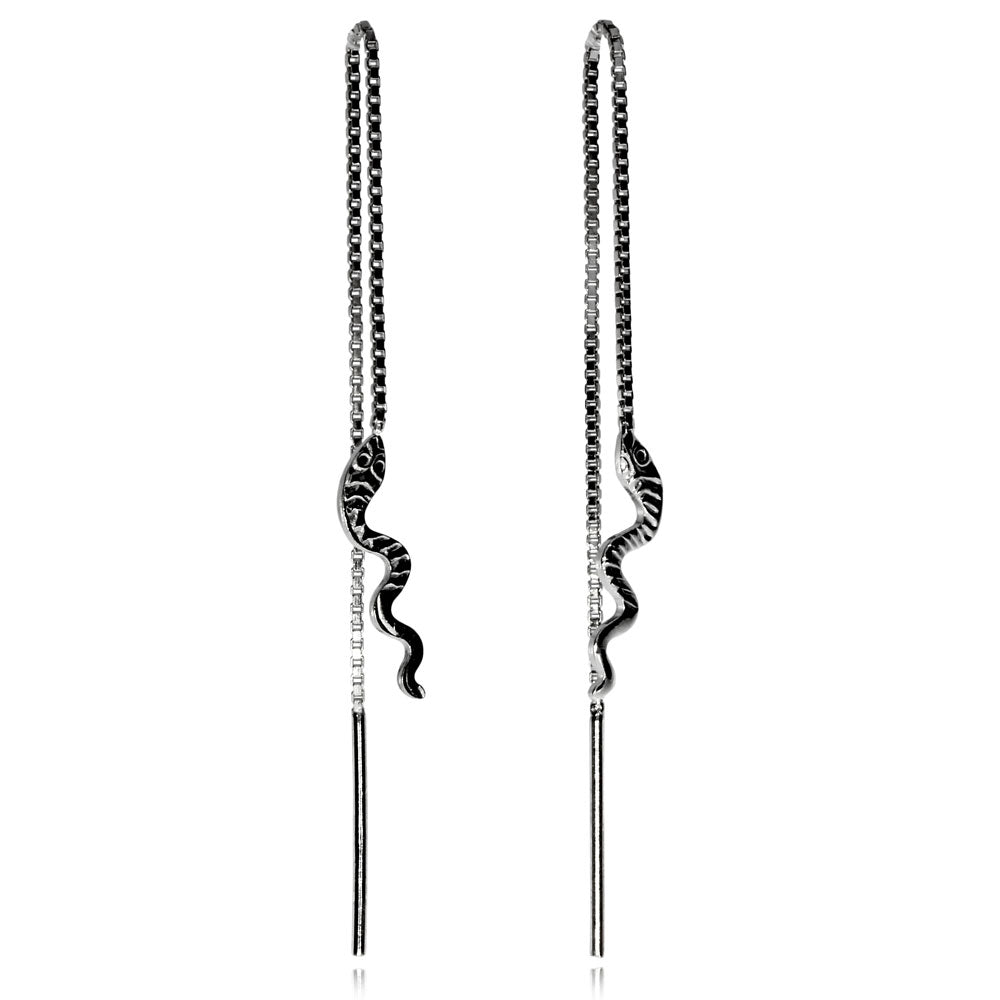 Působivě zpracované dámské visací náušnice, které rozhodně upoutají svým originálním řešením a jednoduchou nápaditostí. Náušnice jsou vyrobené ze zářivého a dobře odolného rhodiovaného stříbra. Tvoří je elegantní provlékací řetízek zakončený ozdobou v podobě drobného hada.