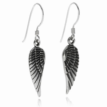 Netradiční visací dámské náušnice v jednoduchém tvaru nesou nápaditý motiv andělských křídel. Andělé jsou oblíbeným symbolem, který se v dávných dobách používal pro ochranu. Každá náušnice představuje jedno pěkně zpracované křídlo, jehož detaily dobře vynikají díky starostříbrné úpravě povrchu.